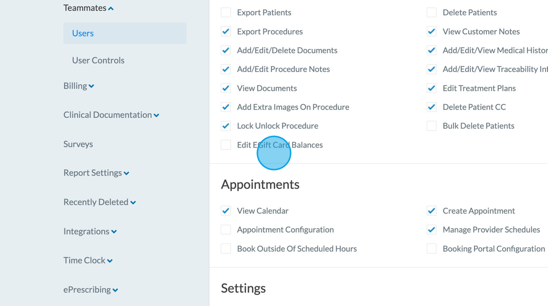 3. Under the Patients Management heading, you will see an option for Edit eGift Card Balances. Click that option to enable and hit Save.
