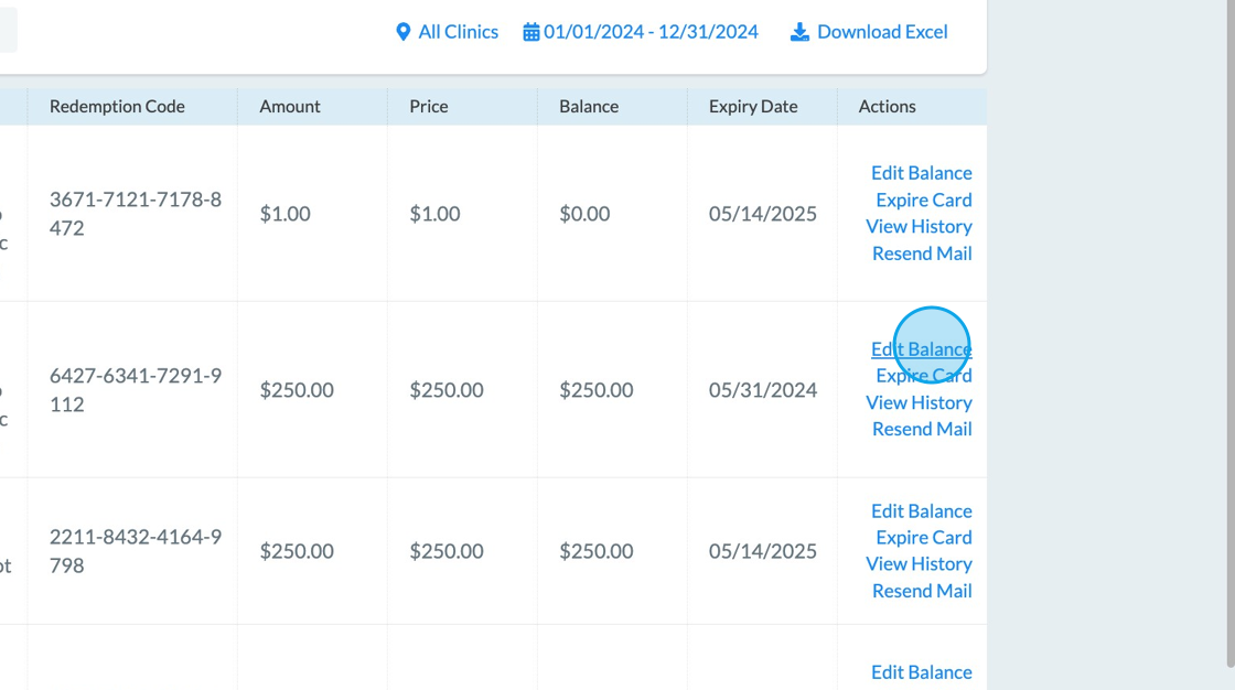 6. Locate the eGift Card you'd like to edit and click Edit Balance