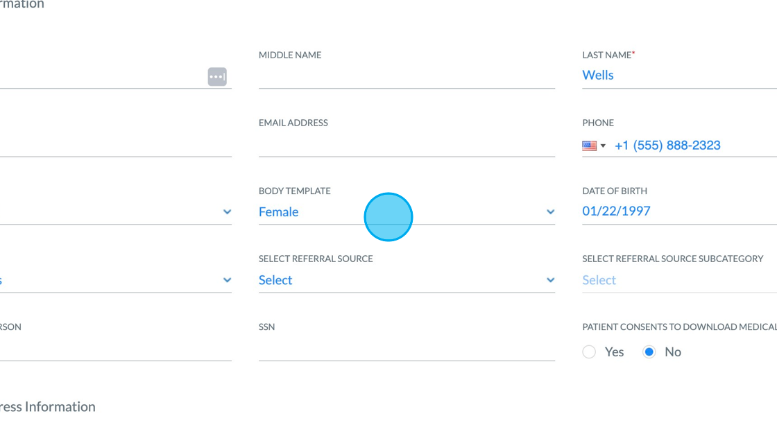 4. Once you choose "Non-Binary," the body template drop down will appear. Although we have a unique Non-binary face chart template, you will have to select a body template. Choose "Male" or "Female" as desired. Note: while the Patient can choose their gender, they cannot assign their body template from the Patient Portal.